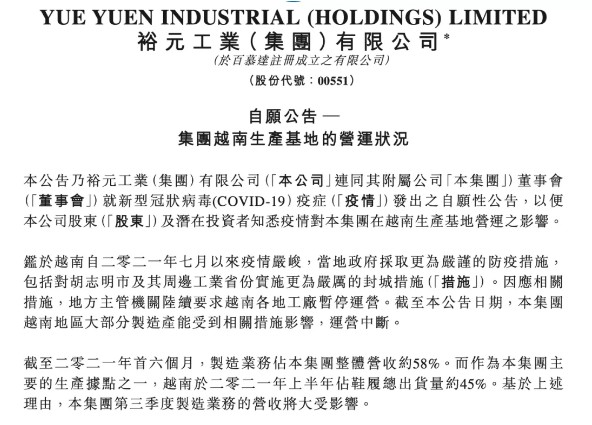 9月3日,负责为国际品牌adidas、Nike等代工制造业务的裕元集团发布公告表示: 受到越南疫情严峻影响,子公司裕元工业旗下位于越南地区的宝元鞋厂因被迫停工,大部分制造产能与营运中断。 由于制造业务占裕元今年上半年整体营收约58%,而越南是裕元的主要生产据点之一,越南今年上半年占鞋履总出货双数约45%。基于上述理由,裕元今年第三季制造业务的...
